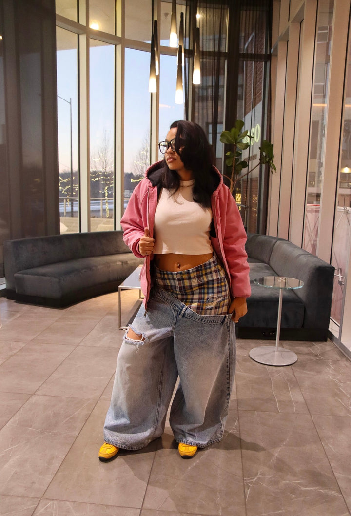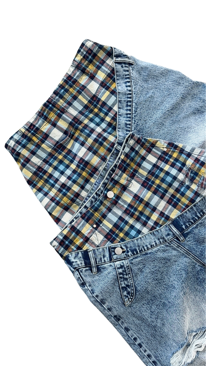- Plaid pattern printed directly on denim (material does not change)